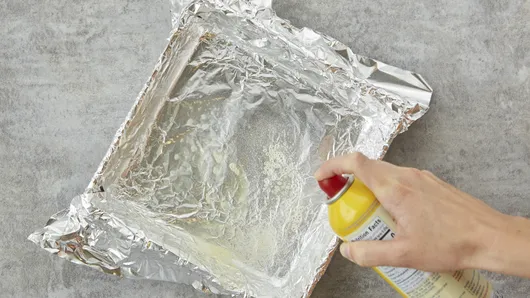 Line 8-inch square pan with foil, leaving foil overhanging at 2 opposite sides of pan; spray foil with cooking spray.
