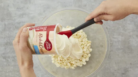 In large microwavable bowl, microwave white chips uncovered on High 1 minute. Spoon frosting over chips. Microwave on High 30 seconds; stir. If necessary, continue to microwave in 15-second increments until mixture can be stirred smooth.
