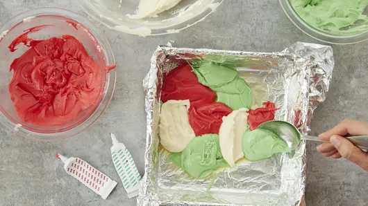 Drop heaping tablespoons of green, red and white fudge mixture in bottom of pan to create random pattern. Pull table knife through layers for marbled design. Refrigerate uncovered until set, about 1 hour.