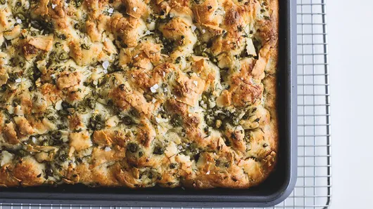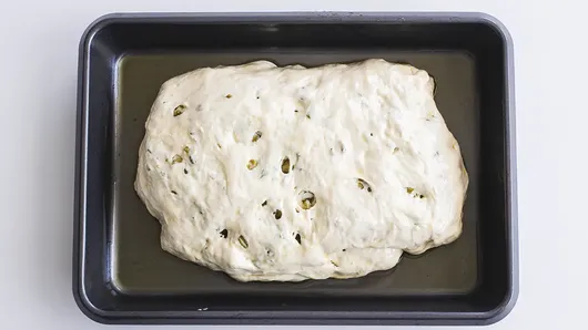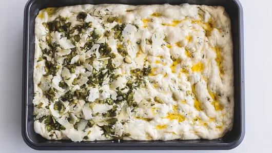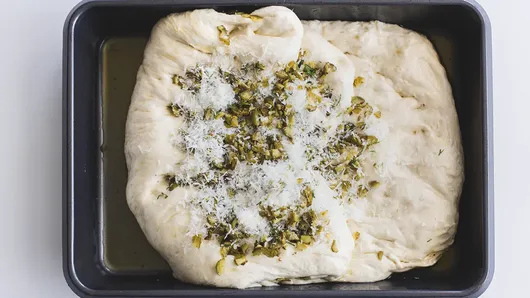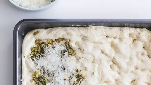 Using your fingers, stretch and dimple the dough all over while pushing it into the corners of the pan. Top with 2 to 4 tablespoons olive oil and the remaining pickle filling. Sprinkle with shaved Pecorino Romano cheese and coarse salt.