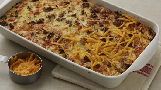 In medium bowl, stir remaining ingredients except remaining cheese with fork or wire whisk. Pour into baking dish.