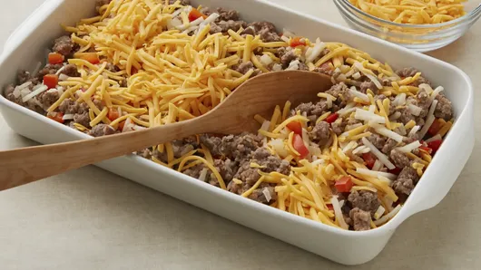 In 12-inch skillet, cook sausage, bell pepper and onion over medium heat 10 to 12 minutes, stirring occasionally, until sausage is no longer pink; drain. Stir together sausage mixture, potatoes and 1 1/2 cups of the cheese in baking dish.