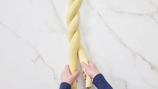 Place the 2 ropes side by side. Pinch the 2 ends together at one end to seal together. Pick 1 rope up, and place over the other side of the second rope. Repeat and continue to loosely twist 1 rope over the other rope until you reach the end. Pinch the ends together to seal so there is 1 long twisted rope of dough.