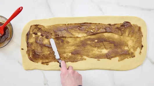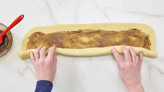 Roll dough up, starting at one long side; pinch seam to seal. Gently roll back and forth to help seal seam and even out the length of the dough rope. Remove second half of dough from refrigerator, and repeat rolling, filling and rolling up.