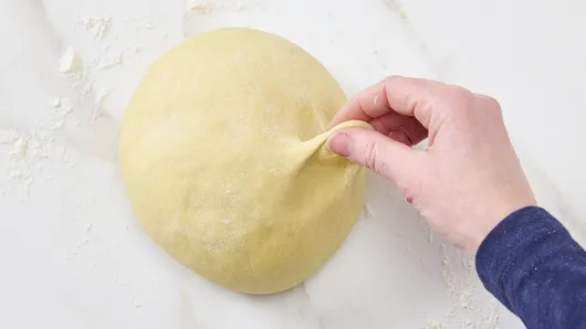 Turn the dough out onto lightly floured surface. Knead a few times by hand to be sure dough is soft, smooth, and elastic. To test elasticity, pinch a piece of the dough and slowly pull away; it should stretch about 2 inches without tearing. Form the dough into a ball. Spray a medium bowl with cooking spray. Place dough in bowl, turning dough to grease all sides. Cover bowl with plastic wrap, and refrigerate 1 hour.