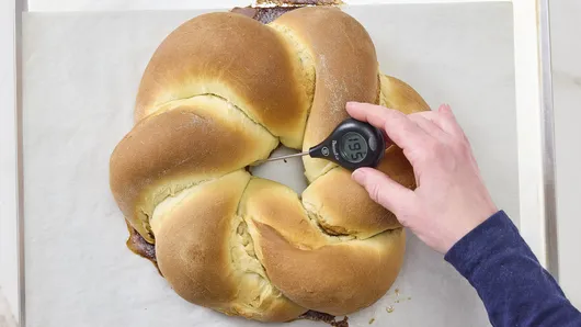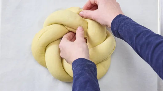 Line a large cookie sheet with cooking parchment paper. Place and form twisted rope into a circle on sheet, pinching ends together. Cover loosely with plastic wrap sprayed with cooking spray; let rise until almost doubled, about 1 hour.
