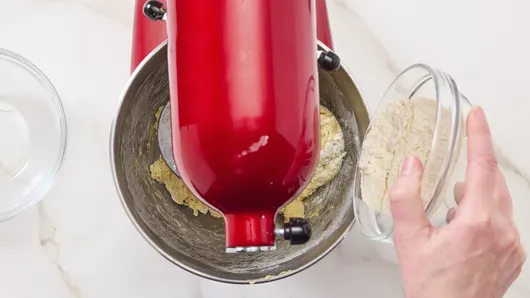 Slowly add the eggs, and continue to mix until eggs are blended (dough will still have some lumps). Scrape bowl. Remove paddle attachment, and replace with dough hook. Gradually add the remaining 1 1/2 cups flour with mixer on low speed to make a soft dough. (Dough may look dry at this point but will come together when butter is added.)