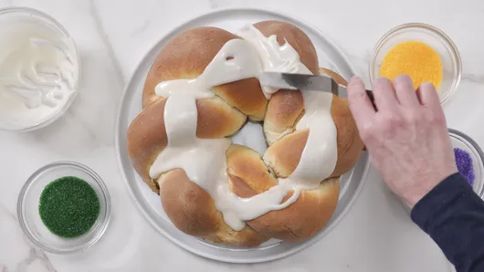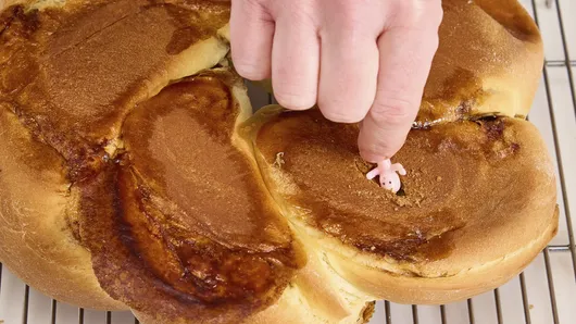 When ready to serve, remind people that there is a hidden plastic baby in bread. Store loosely covered at room temperature.