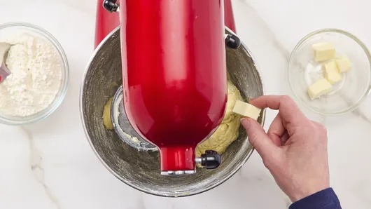 Gradually add the 6 tablespoons of softened butter, a piece at a time, kneading until each piece of butter is almost absorbed before adding the next piece. (Dough will look sticky.) Scrape side of bowl occasionally. Increase to medium speed, and continue kneading for 5 minutes or until dough is soft, smooth, and elastic. If dough seems too sticky, add additional flour 1 tablespoon at a time, mixing in thoroughly before determining if more flour is needed.