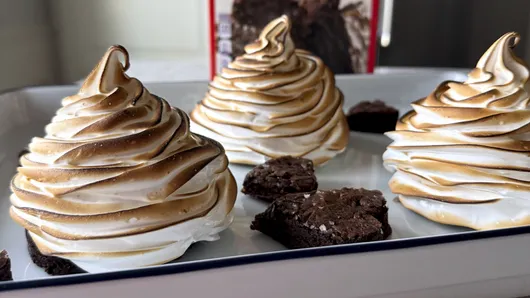 Remove the ice cream-topped brownie circles from the freezer. Using a piping bag fitted with a star tip, pipe the meringue on top of the ice cream, enrobing the ice cream completely. Place back into the freezer for 1 hour.