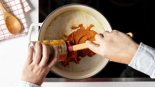 Add the coconut milk, pumpkin puree, water and salt. Stir to combine and bring to a gentle simmer. Continue to cook, stirring occasionally, for 15 minutes.