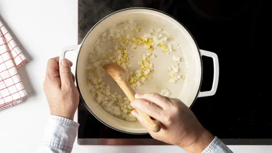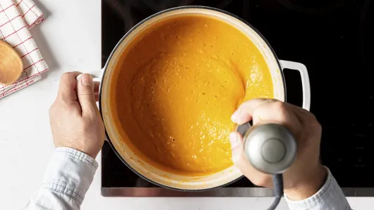 Using a blender or immersion blender, puree the soup until smooth, 1 minute.