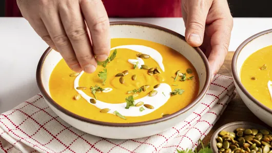 Ladle the soup into bowls and garnish with sour cream or crème fraîche, pumpkin seeds, and cilantro.