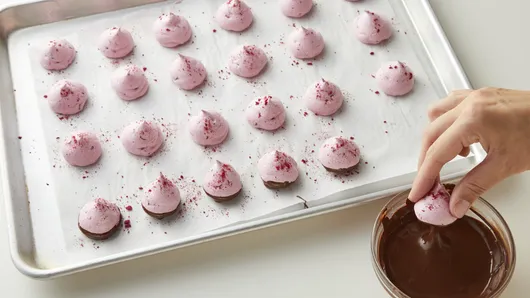 With their airy texture, pretty pink color and sweet-tangy flavor, these chocolate-dipped and raspberry-dusted meringues are true showstoppers! But don’t let their impressive look intimidate you. All you really need to make this recipe is a hand mixer and these easy-to-follow directions from the Betty Crocker™ Test Kitchens. Once you get down to it, we think you’ll find that transforming a bowl full of wet ingredients into cumulus-grade fluff is a delightful way to play mad scientist—with an absolutely delicious payoff!