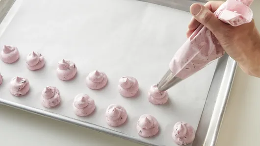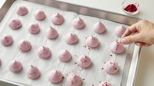Place both cookie sheets in oven. Bake 15 minutes. Rotate pans to different racks and turn from front to back. Bake 15 minutes more. Turn off oven; leave meringues in oven with door closed 30 minutes. Remove from oven. Sprinkle over tops of meringues the remaining 1 teaspoon ground raspberries. Place pans on cooling racks; continue to cool at room temperature, about 2 hours. Remove from parchment paper; place meringues on cookie sheets that have been lined with new cooking parchment paper.