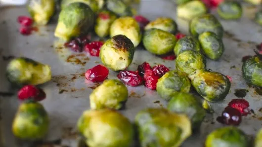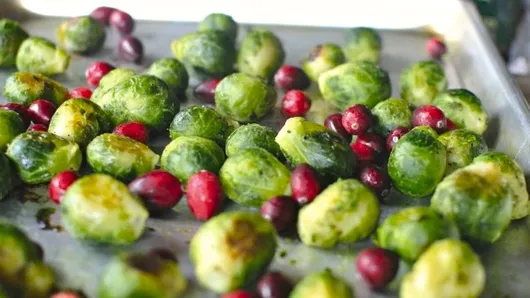 Toss the thawed Brussels sprouts in the olive oil before popping into the oven for 15 to 20 minutes. Once they start turning golden, remove and add the 1/2 cup of fresh cranberries.